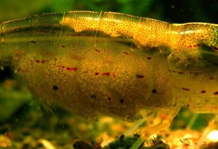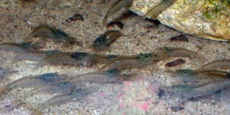In questa fase, la femmina va tolta dall’acquario e messa in una nursery, sempre con acqua dolce: i gamberi tollerano un’alta salinità, ma le uova non si schiudono in acqua salmastra.