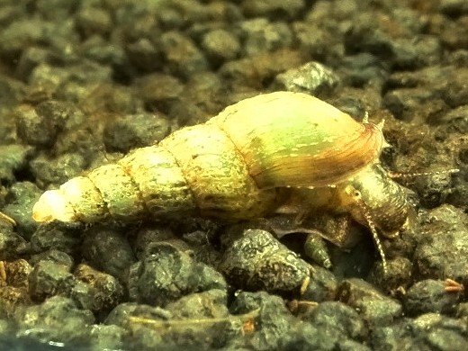 Ha una conchiglia destrorsa allungata, a strisce gialle e nere; raggiunge i 7 cm in natura, ma molto meno in acquario.