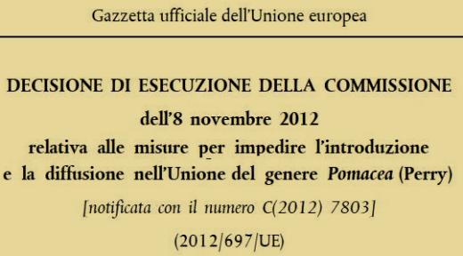Una direttiva europea, dell’ottobre 2012, vieta l’importazione e la diffusione del genere Pomacea, nei paesi dell’Unione, senza alcuna distinzione fra le specie.