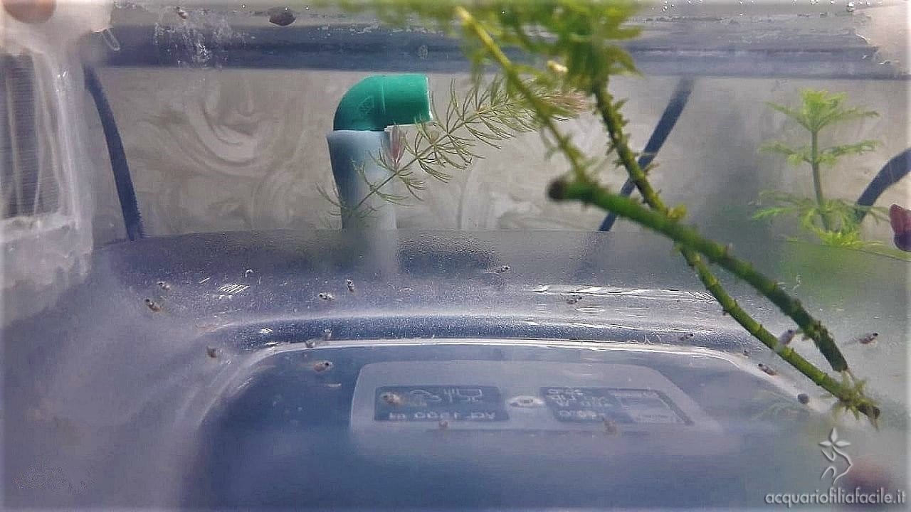 Per l’incubazione io ho utilizzato un piccolo contenitore di plastica, a cui ho provveduto a intagliare tutti e cinque i lati, rivestendolo completamente con tulle per confetti, per garantire una buona ossigenazione delle uova. Questa struttura l’ho posizionata nei pressi dell’uscita del filtro in modo che il flusso d’acqua passasse attraverso il contenitore.