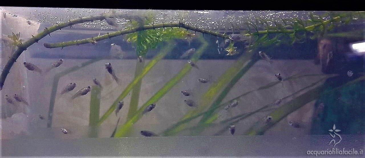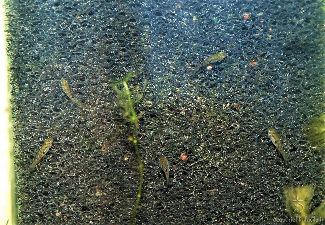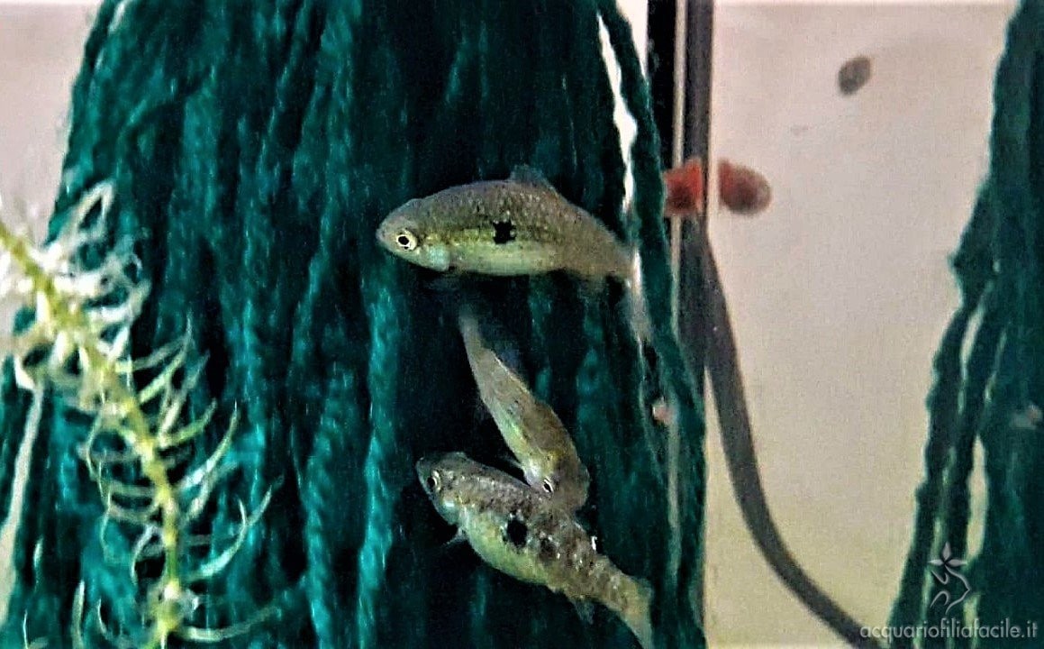 Io ho osservato un’incubazione di 3- 5 giorni nella bella stagione: i piccoli si sviluppano rapidamente e alla nascita sono lunghi appena 3-4 mm e non si alimentano per i primi 1-2 giorni. Successivamente gli avannotti si nutrono dapprima di infusori e successivamente di microworms e naupli d’artemia appena schiusi.