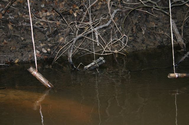 Queste canne vengono fatte affondare lungo le sponde dei fiumi, legate ai rami degli alberi o a dei galleggianti.
