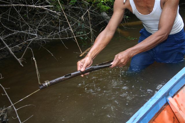 La tecnica maggiormente usata consiste nell’usare grosse canne di bambù, lunghe circa due metri, lungo le quali vengono praticati numerosi fori, di diametro tale da lasciar passare solo gli esemplari di taglia consentita.