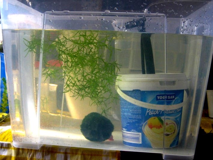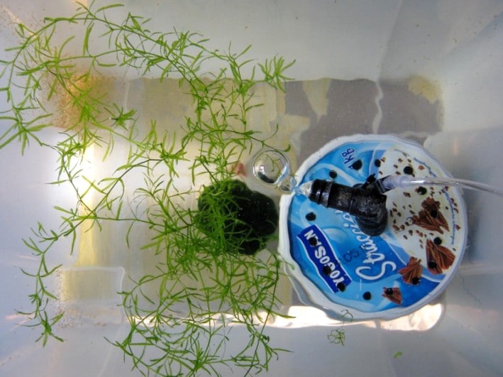 La vasca (senza filtro) deve essere esageratamente piantumata con galleggianti, compresa la Lemna minor (tra le altre cose, è un ottimo cibo vegetale gratis, per gli adulti…).