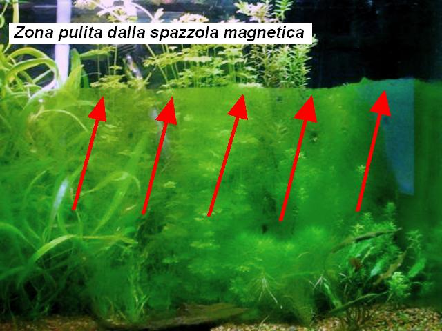 Talvolta si forma un leggero strato di polvere verde, ben visibile sul vetro. La spazzola magnetica lo stacca con tale facilità che qualcuno crede siano diatomee.