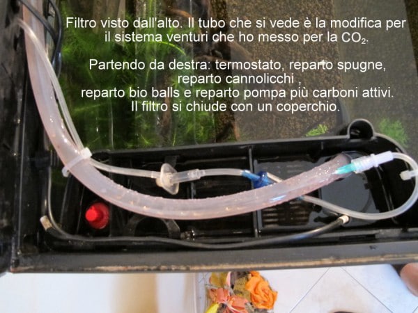Si può posizionare, grazie a comodi binari, sia nei lati corti come nel lato lungo posteriore; è silenzioso e diviso in quattro scomparti, dove si trovano il termostato, le spugne, i cannolicchi, le bio balls e la pompa, con la spugna a carboni attivi (tutti i materiali filtranti sono compresi).
