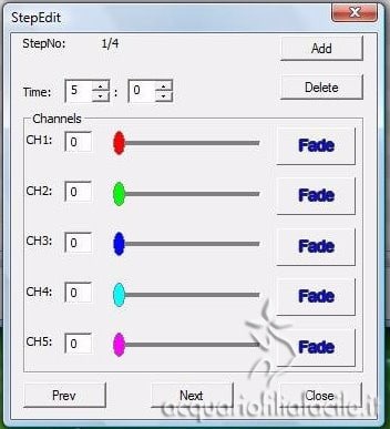 Nota: Il tasto «Fade» della finestra Step Edit determina se effettuare il passaggio graduale dall’impostazione visualizzata a quella successiva. Se lo premiamo diventa «Jump», quindi realizza il passaggio da uno Step all’altro senza gradualità. Può essere usato, ad esempio, per attivare ad un dato orario una ventola, oppure aprire la elettrovalvola per la CO2.