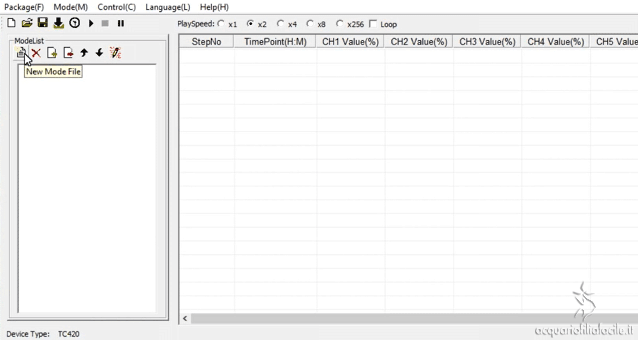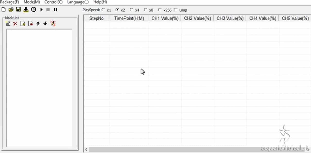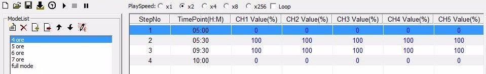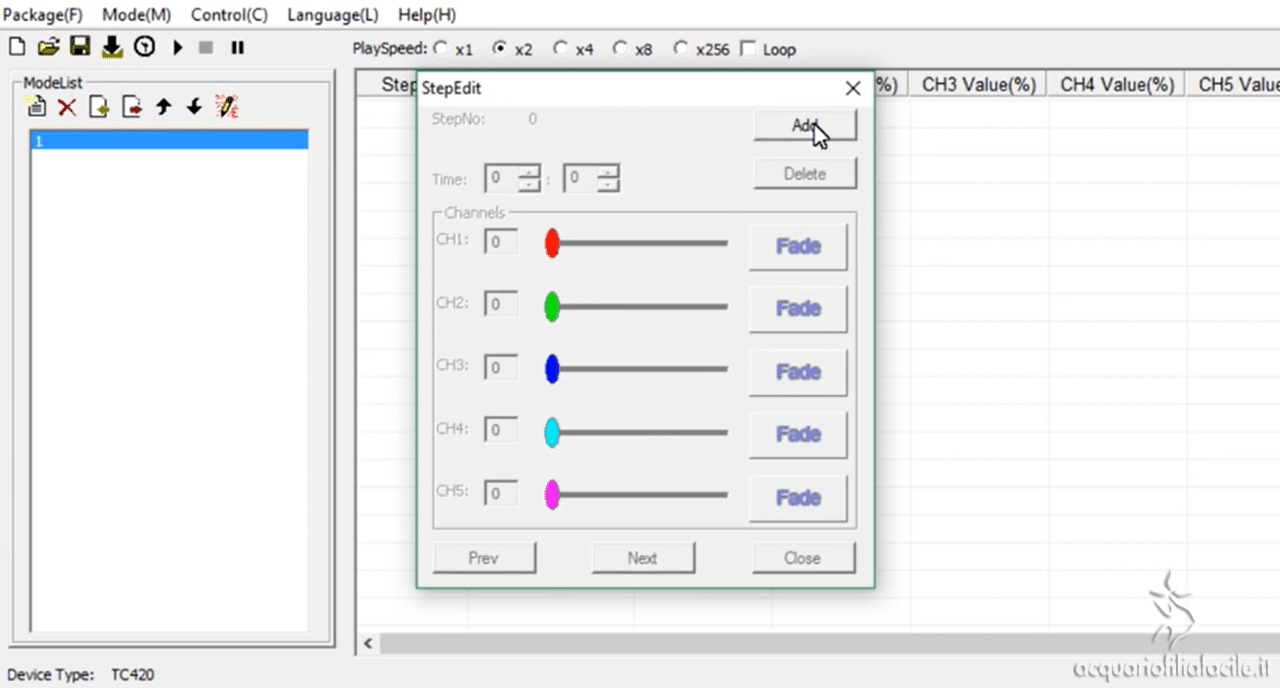 Passiamo a programmare il primo «Time Point», ovvero l’orario d’inizio dell’alba; nel nostro caso è alle ore 05:00. Imposteremo anche l’intensità di corrente da erogare per ogni canale a quell’ora, che sarà 0%.