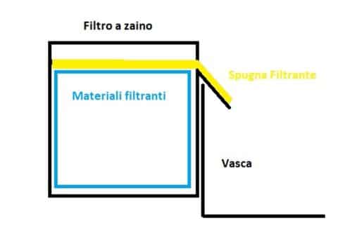 L’acqua viene prelevata dalla vasca e reimmessa attraverso una cascatella, dopo aver attraversato i materiali filtranti.