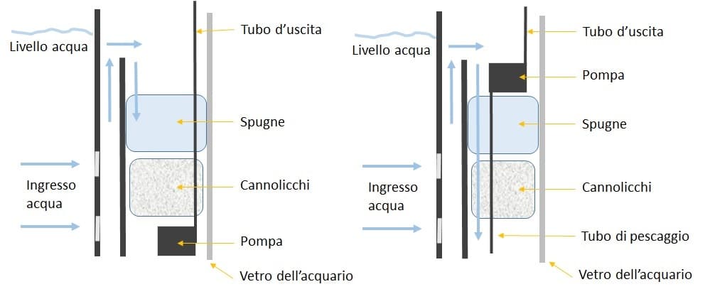 - in basso, sotto i materiali filtranti: l’acqua è pescata dal fondo e, tramite un tubo, ritorna nell’acquario dall’alto;