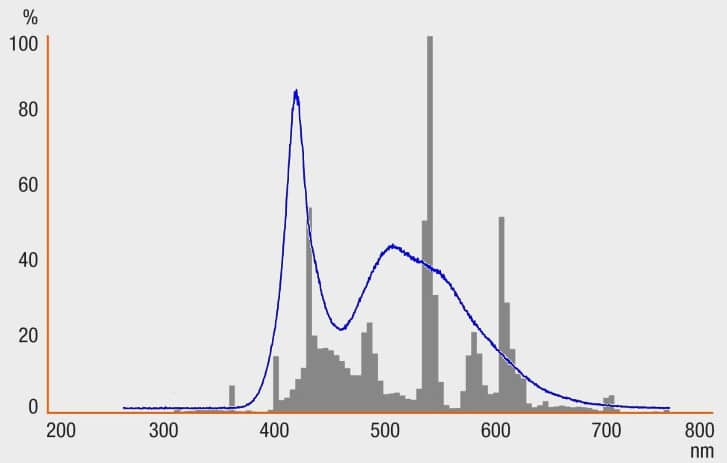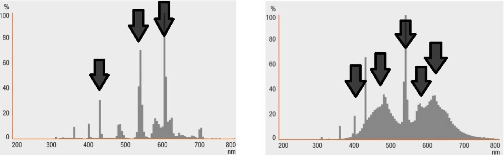 Lo spettro di una lampada fluorescente, quindi, evidenzierà dei picchi in corrispondenza dei tre o cinque fosfòri presenti.