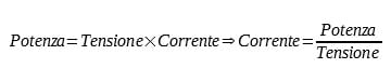 Ad esempio, le strisce in bobina con LED, di norma, richiedono un’alimentazione a 12 o 24 volt, mentre la corrente minima da fornire va derivata, se non specificato, dalla potenza in watt della striscia, per mezzo delle relazioni: