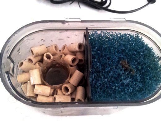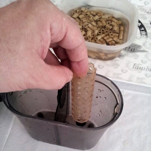 Poi ho inserito lana di perlon sotto di essa. - Nello scomparto dei cannolicchi, ho eliminato la spugna cilindrica dal sifone di aspirazione. Poi ho inserito un tubetto traforato, che durante le operazioni di pulizia non si sfili dal suo supporto, rimanendo incastrato tra i cannolicchi.