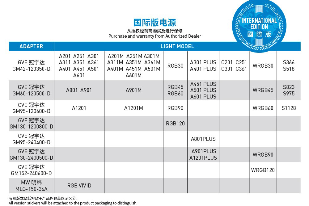 - plafoniera WRGB60: 204 LED (60 rossi, 18 blu, 36 verdi, 84 bianchi), 50 W, 3500 lm;