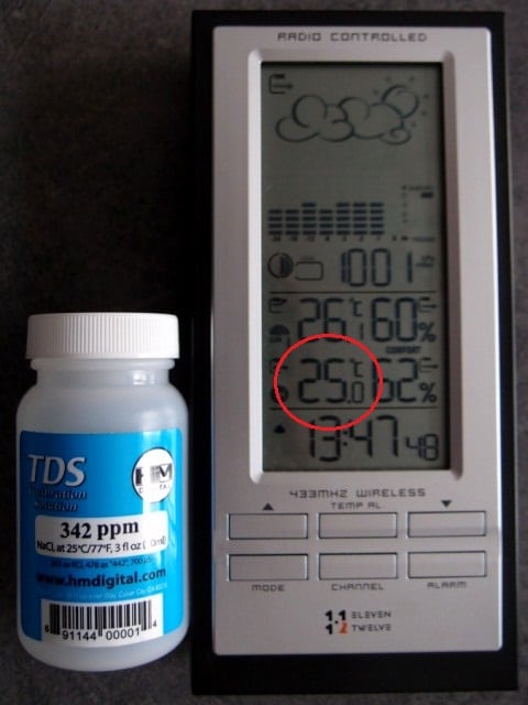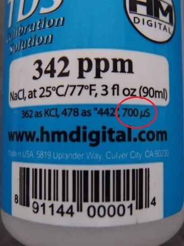 Torniamo alla soluzione-campione: anche qui, l’etichetta riporta la conduttività a una certa temperatura, in questo caso 25°C.
