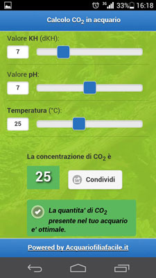 muovendo gli slider a destra e sinistra o inserendo i valori manualmente di pH, KH e temperatura, verrà calcolata automaticamente la concentrazione di CO2 presente nel vostro acquario con relativi messaggi di valutazione.
