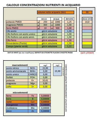 Ho pensato allora di agevolare gli utilizzatori del PMDD elaborando con Excel una semplice tabella (scaricabile e che, quindi, non necessita di connessione internet per essere utilizzata) in cui le percentuali dei componenti dei vari flaconi sono preimpostate (secondo le ricette di AF-Rox) ma sono modificabili a piacimento e se ne possono aggiungere quante se ne vuole, permettendo così di ottenere velocemente le concentrazioni dei nutrienti in vasca, partendo dalle dosi di fertilizzanti inserite, senza dover ogni volta reinserire i dati della propria vasca e dei propri flaconi.